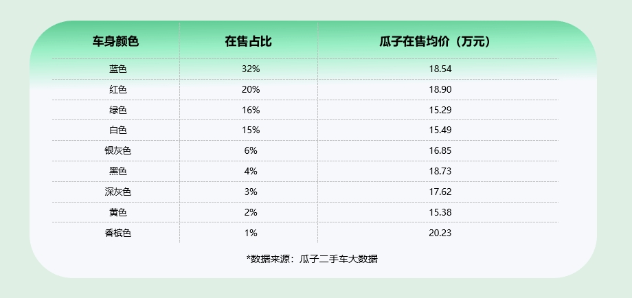 在颜色选择上,问界M5提供了多种车身颜色供消费者选择。蓝色和红色是最受欢迎的颜色,占据了二手市场的一半以上。而对于追求性价比的消费者来说,绿色车身的车型则是一个不错的选择,其售价相对较低且依然美观。