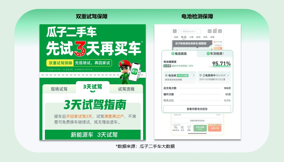 最后,在购买新能源二手车时,消费者需要关注试驾与电池检测环节。新能源二手车的电机和电控系统耐用性较高,但电池状况却难以全面了解。瓜子二手车平台通过“双重试驾”和专业评估师的检测,确保消费者在购买前能够全面了解车辆的动力性能和电池能力。瓜子还推出了电池检测报告和电池险服务,进一步提升了新能源二手车的可靠性。